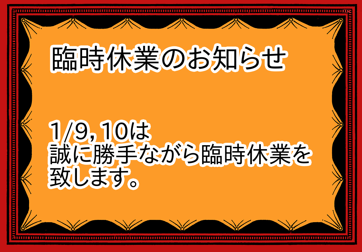 1月9日、10日は臨時休業させていただきます。 2026年1月4日イベント告知鈴村 純 【臨時休業のお知らせ】 1月9日、10日は都合により臨時休業とさせていただきます。 何卒ご了承くださいますようお願い致します。